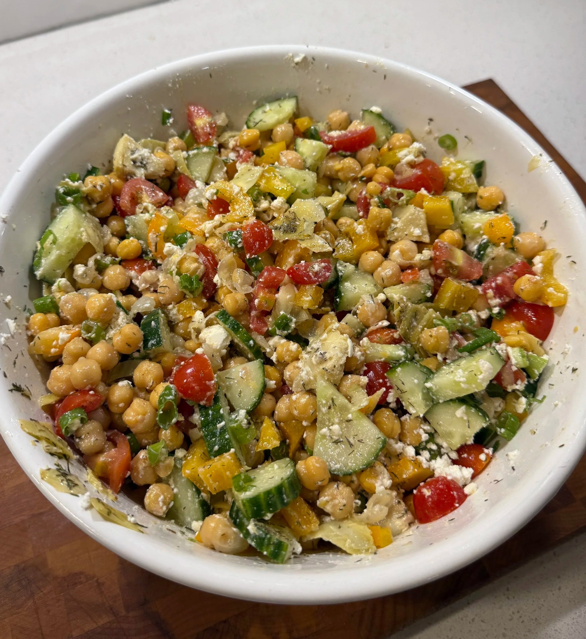 In a large bowl, add the chickpeas, cucumber, bell pepper, cherry tomatoes, and artichokes.